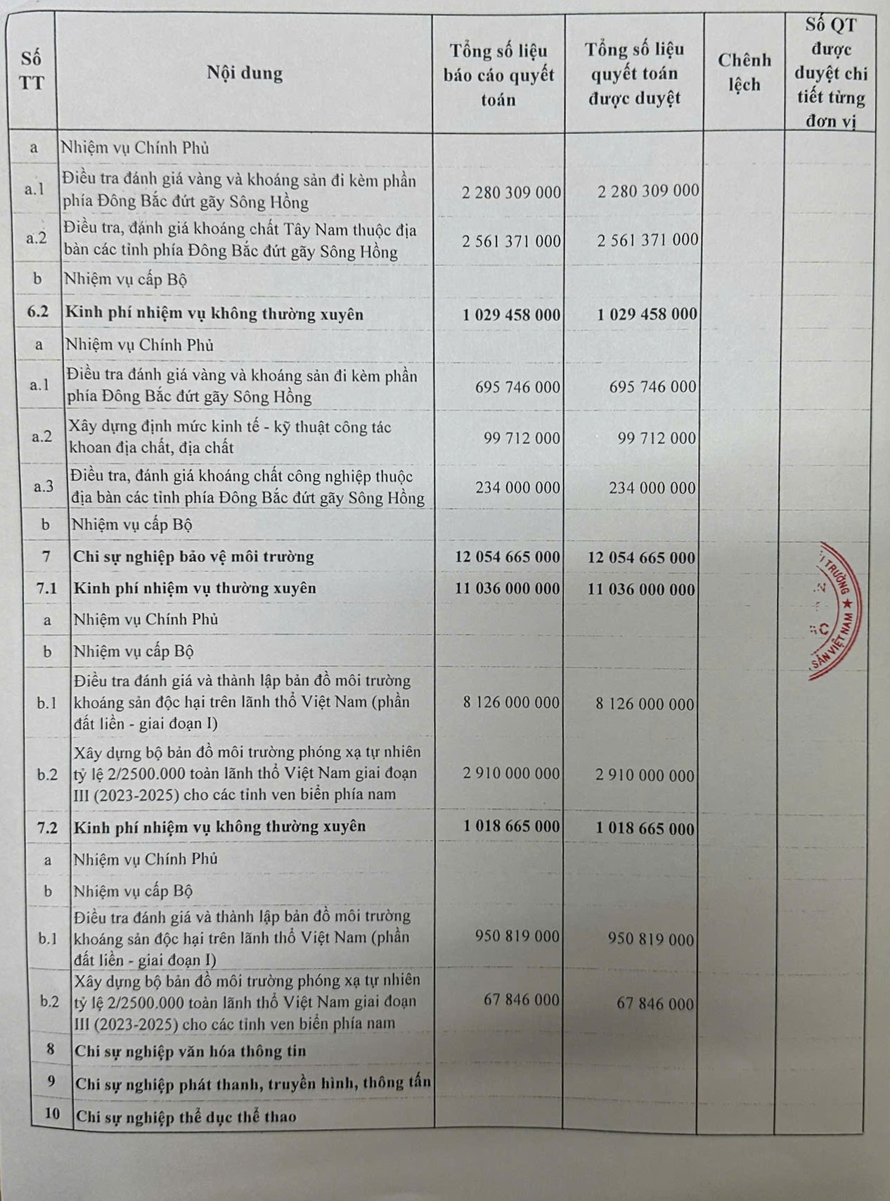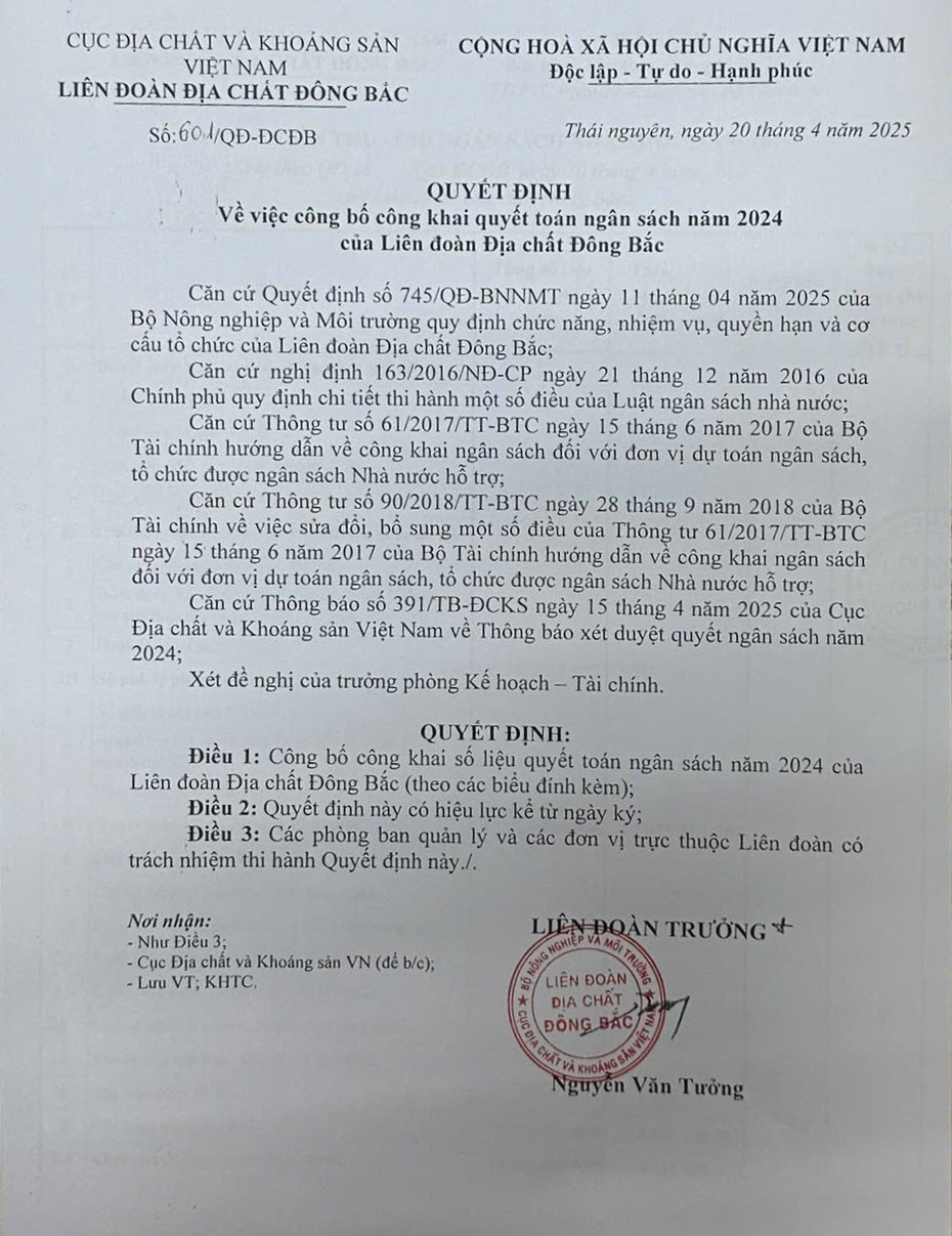 Hoạt động khoáng sản, Tin tức & Sự kiện, Tin tức nổi bật, Văn bản tài liệu QUYẾT ĐỊNH về việc công bố công khai quyết toán ngân sách năm 2024 của Liên đoàn địa chất Đông Bắc Thời gian đăng: 09:09 30/09/2025 Họp giao ban tháng 10: Liên đoàn địa chất Đông Bắc kiện toàn công tác cán bộ 03/10/2025 Đồng chí Nguyễn Văn Tưởng được Bộ Nông nghiệp và Môi trường tặng Bằng khen 02/10/2025 Liên đoàn Địa chất Đông Bắc: 6 đồng chí tiêu biểu được khen thưởng tại Hội nghị điển hình tiên tiến 01/10/2025 Đại hội Đảng bộ Liên đoàn địa chất Đông Bắc lần thứ XV, nhiệm kỳ 2025 – 20230 01/10/2025 Thông báo về việc lựa chọn tổ chức đấu giá tài sản 01/10/2025 QĐ Về việc công bố công khai dự toán ngân sách năm 2025 của Liên đoàn Địa chất Đông Bắc 30/09/2025